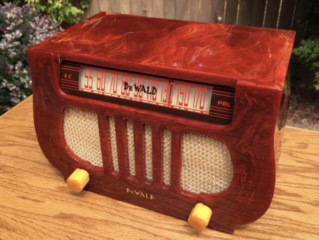 Talk about beautiful Catalin! This cleverly designed “Harp” is a 1938 DeWald Model A501 in the oxblood color. It’s very shiny and in perfect condition. It’s all original except the excellent replacement grille cloth.