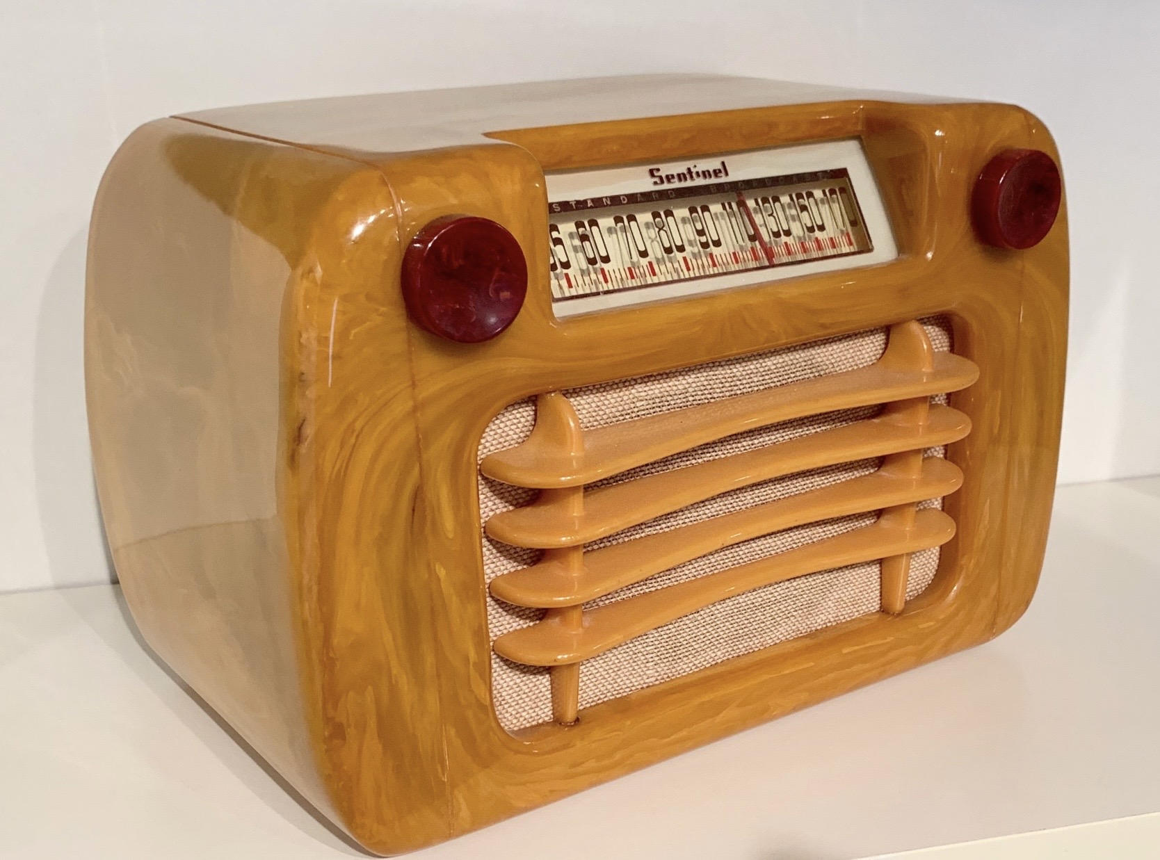 This was one of my “must have” radios, a 1945 Sentinel Model 284 with a highly swirled Sand Catalin case. Notice how the swirls add to the design of the radio. The original red swirled Catalin knobs are a real bonus, because knobs made of red Catalin are rare. A completely beautiful example of the most uniquely designed well-rounded Catalin radio. No problems at all.
